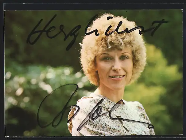 AK Musikerin Bibi Johns lächelnd mit lockigem Haar, mit Autograph
