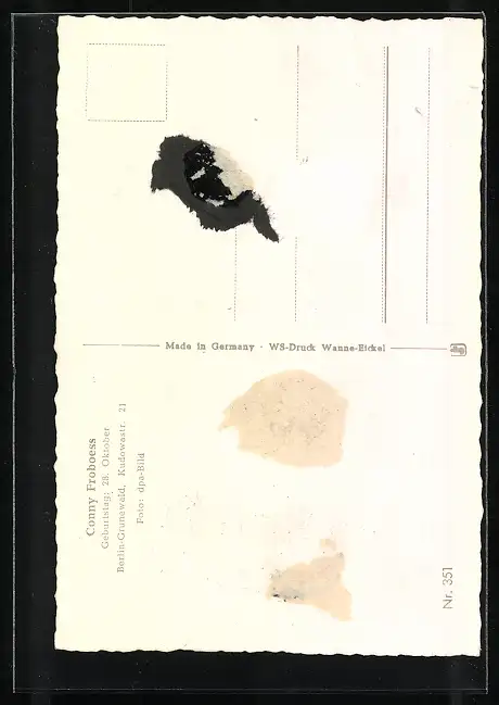 Personenbezogene Daten auf der Rückseite der Karte wurden durch blauen Textmarker unkenntlich gemacht. Die blauen Stellen sind auf die Vorderseite durchgeweicht und wirken sich negativ auf das Postkartenfoto aus