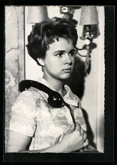 AK Musikerin Conny Froboess mit einem Telefon-Hörer auf der Schulter