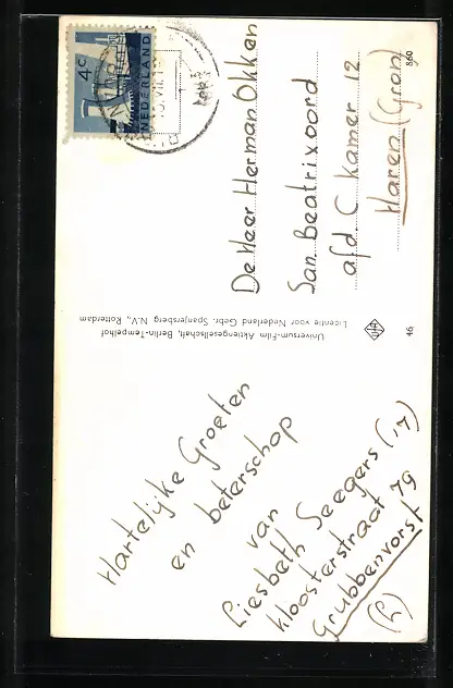 Personenbezogene Daten auf der Rückseite der Karte wurden durch blauen Textmarker unkenntlich gemacht. Die blauen Stellen sind auf die Vorderseite durchgeweicht und wirken sich negativ auf das Postkartenfoto aus