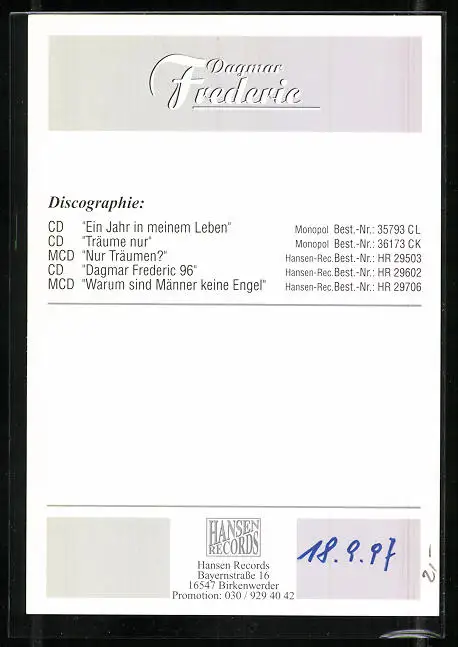 AK Musikerin Dagmar Frederic im Porträt, original Autograph