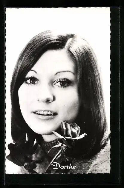 AK Musikerin Dorthe mit einer Rose in die Kamera blickend
