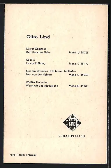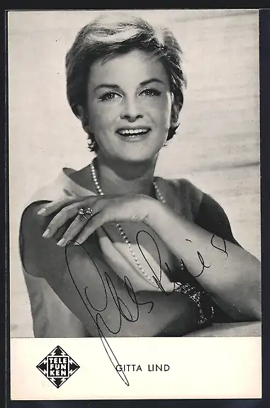 AK Musikerin Gitta Lind lächelnd mit einer Perlenkette, mit Autograph