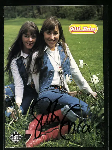 AK Musikerin Gitti und Musikerin Erica in Jeanswesten auf einer Wiese sitzend