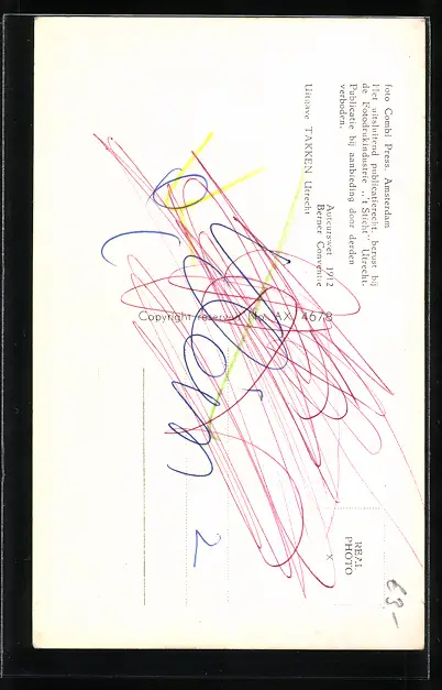 Personenbezogene Daten auf der Rückseite der Karte wurden durch blauen Textmarker unkenntlich gemacht. Die blauen Stellen sind auf die Vorderseite durchgeweicht und wirken sich negativ auf das Postkartenfoto aus