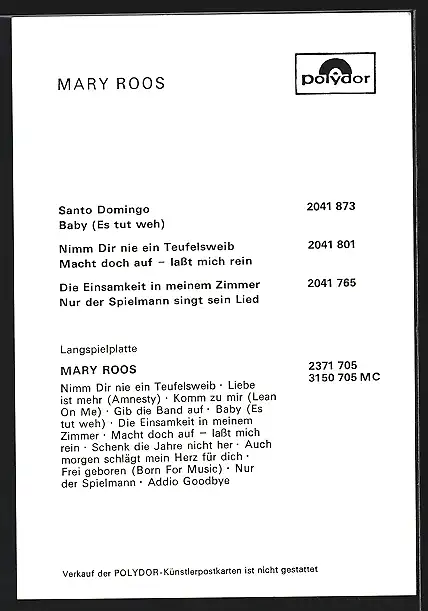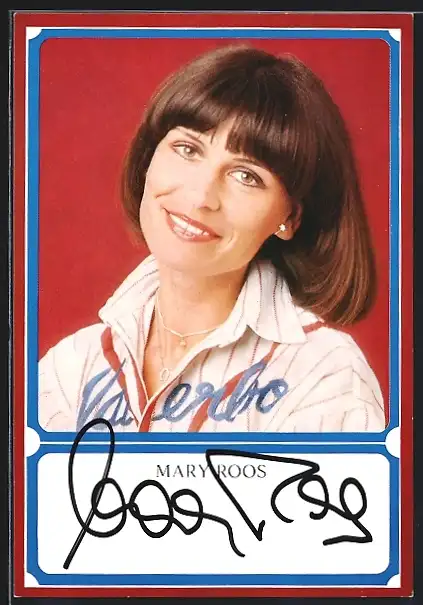 AK Musikerin Mary Roos mit breitem Lächeln und gestreifter Bluse, mit Autograph