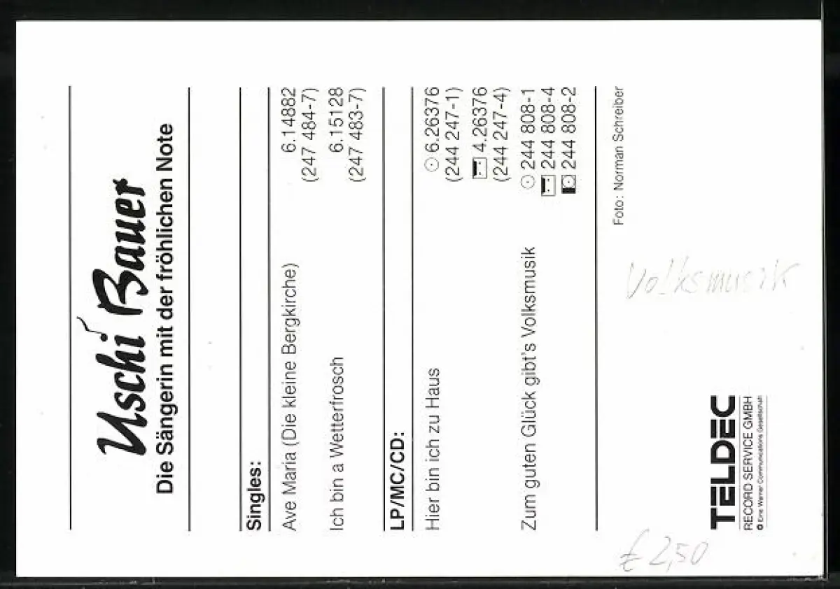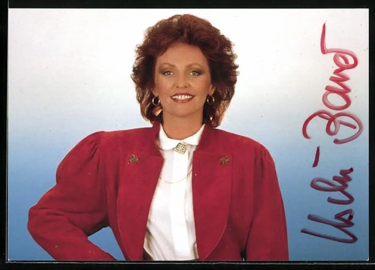 AK Musikerin Uschi Bauer in rotem Jackett, Autograph