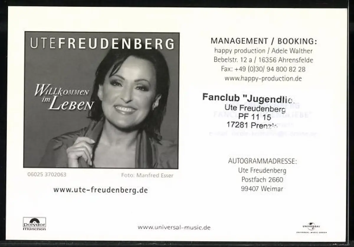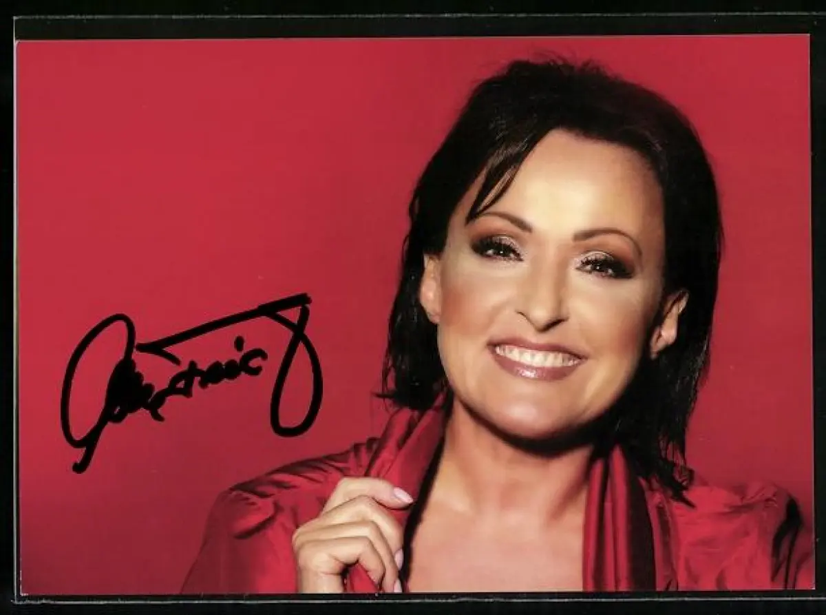 AK Musikerin Uta Freudenberg lächelnd im Porträt mit Autograph