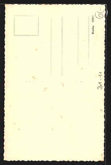 Personenbezogene Daten auf der Rückseite der Karte wurden durch blauen Textmarker unkenntlich gemacht. Die blauen Stellen sind auf die Vorderseite durchgeweicht und wirken sich negativ auf das Postkartenfoto aus