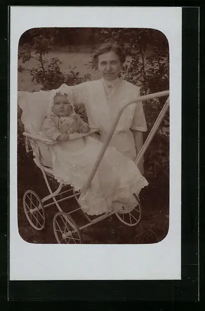 AK Mutter kniet neben ihrem Baby im Kinderwagen
