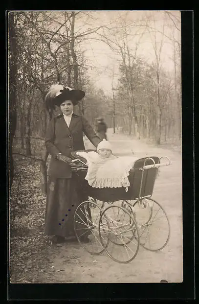 AK Mutter mit Baby im Kinderwagen beim Waldspaziergang