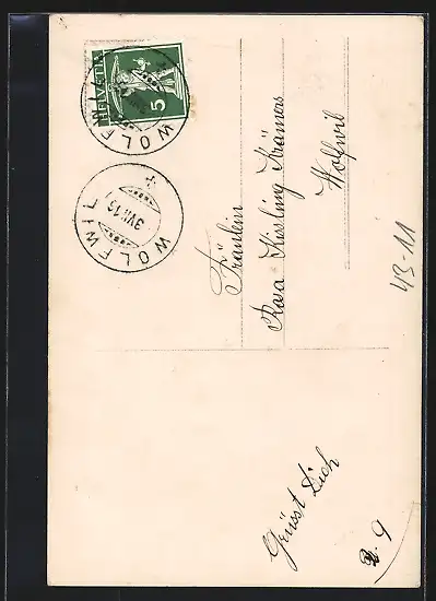 Personenbezogene Daten auf der Rückseite der Karte wurden durch blauen Textmarker unkenntlich gemacht. Die blauen Stellen sind auf die Vorderseite durchgeweicht und wirken sich negativ auf das Postkartenfoto aus