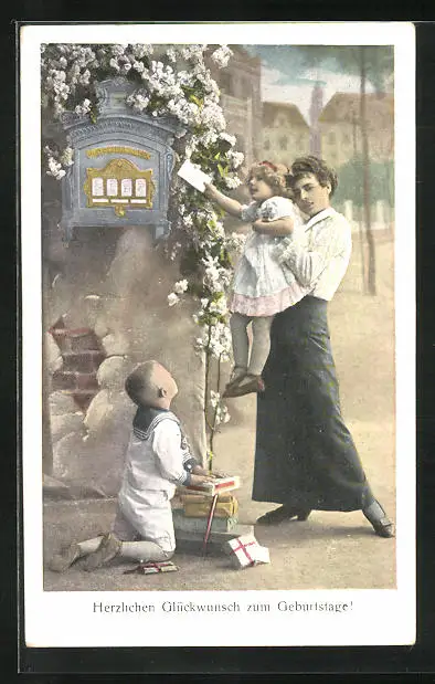 AK Mutter mit Kindern am Briefkasten
