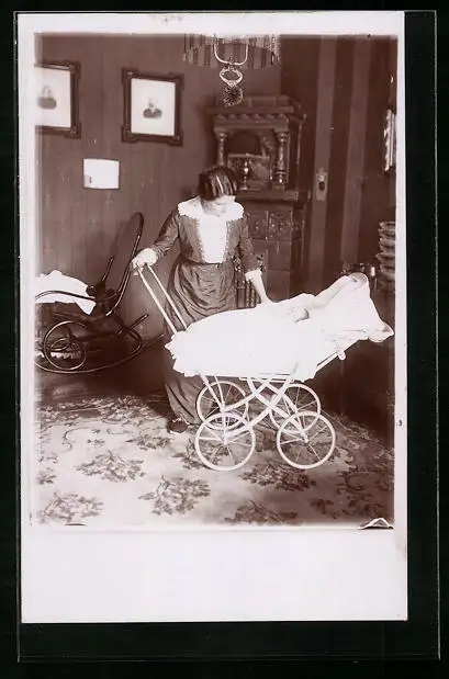 AK Mutter mit Kleinkind im Kinderwagen in der Wohnstube