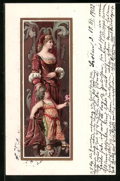AK Mutter und Sohn mit Ornamenten, Jugendstil