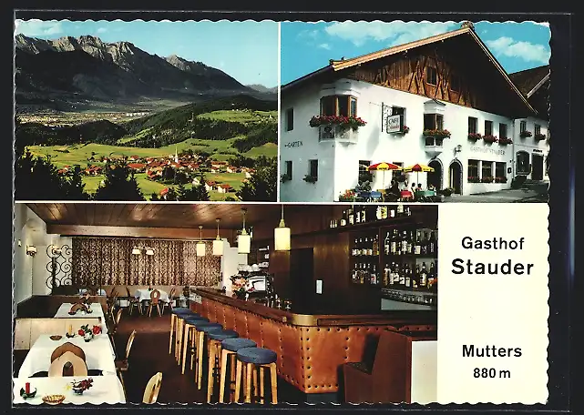 AK Mutters /Tirol, Der Gasthof Stauder mit Innenansicht und Panoramablick