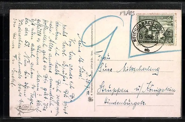 Personenbezogene Daten auf der Rückseite der Karte wurden durch blauen Textmarker unkenntlich gemacht. Die blauen Stellen sind auf die Vorderseite durchgeweicht und wirken sich negativ auf das Postkartenfoto aus
