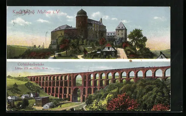 AK Mylau i. V., Kaiserschloss mit Göltzschtalbrücke