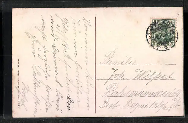 Personenbezogene Daten auf der Rückseite der Karte wurden durch blauen Textmarker unkenntlich gemacht. Die blauen Stellen sind auf die Vorderseite durchgeweicht und wirken sich negativ auf das Postkartenfoto aus