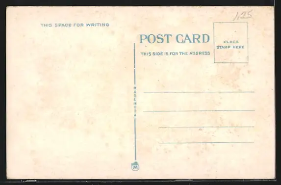 Personenbezogene Daten auf der Rückseite der Karte wurden durch blauen Textmarker unkenntlich gemacht. Die blauen Stellen sind auf die Vorderseite durchgeweicht und wirken sich negativ auf das Postkartenfoto aus