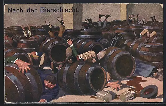 AK Nach der Bierschlacht, Betrunkene in Fässern, Trinkerhumor