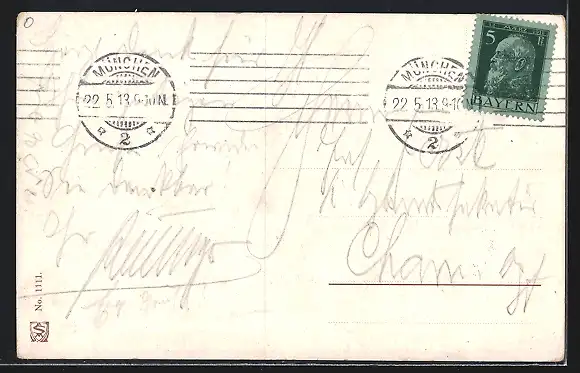 Personenbezogene Daten auf der Rückseite der Karte wurden durch blauen Textmarker unkenntlich gemacht. Die blauen Stellen sind auf die Vorderseite durchgeweicht und wirken sich negativ auf das Postkartenfoto aus