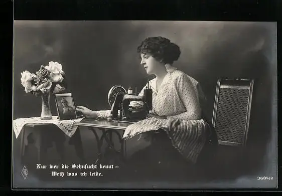 AK Näherin sitzt an der Nähmaschine und denkt an ihren Geliebten