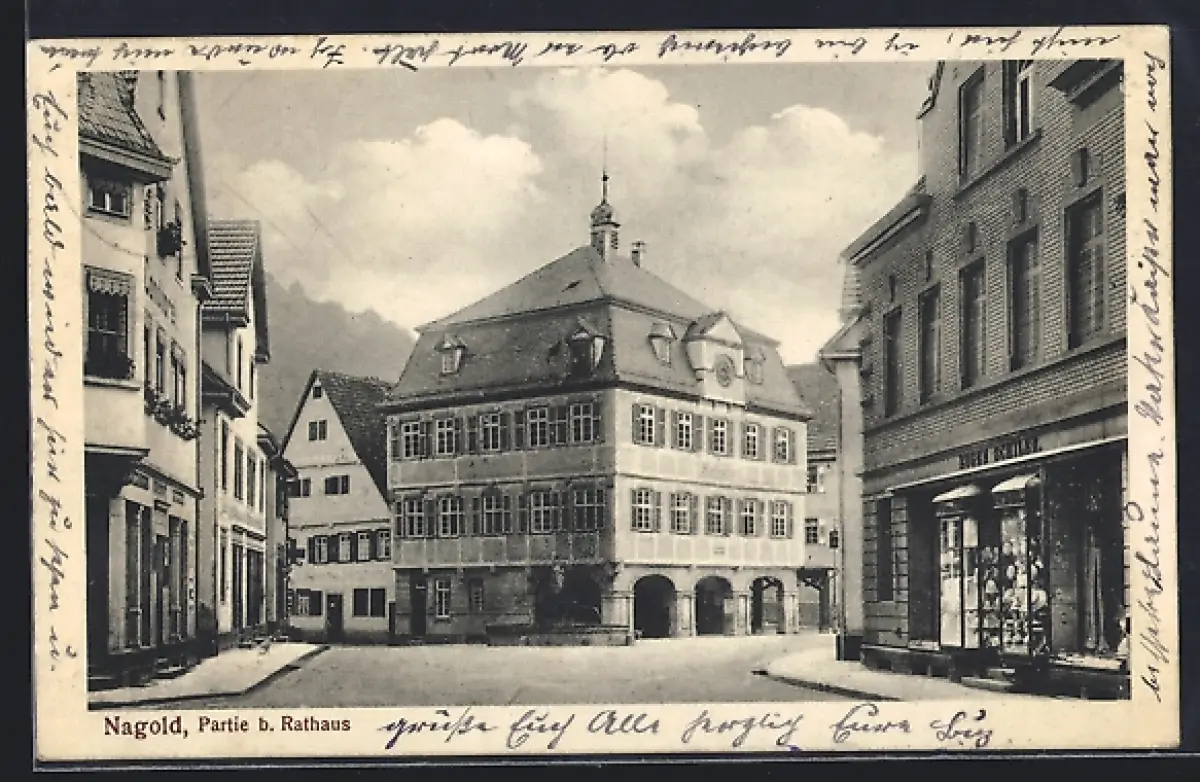 AK Nagold, Strassenpartie beim Rathaus mit Geschäft Bogen Schiler
