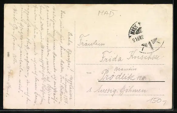 alte Ansichtskarte, gelaufen 1916, Briefmarke entfernt, rückseitig Oberflächenschaden, guter Zustand