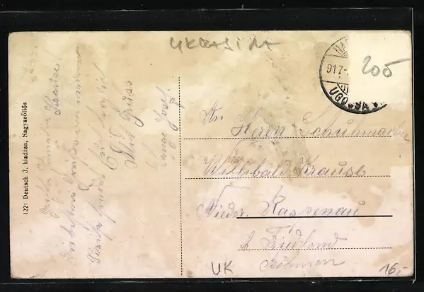 Personenbezogene Daten auf der Rückseite der Karte wurden durch blauen Textmarker unkenntlich gemacht. Die blauen Stellen sind auf die Vorderseite durchgeweicht und wirken sich negativ auf das Postkartenfoto aus