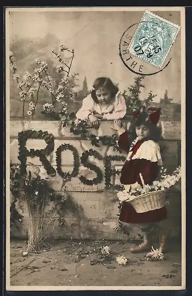AK Namenstag Rose, Zwei Mädchen an einer Mauer