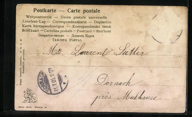 alte Ansichtskarte, gelaufen 1905, Briefmarke entfernt, rückseitig Oberflächenschaden, Eckknicke re., guter Zustand