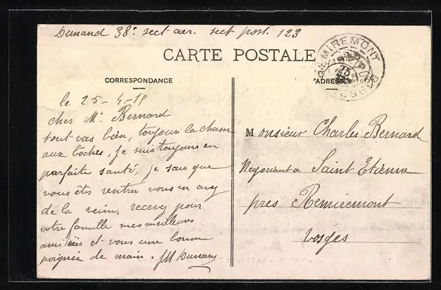 gelaufen 1915, Eckknick re. oben, Bugspuren li. u. re. oben, guter Zustand