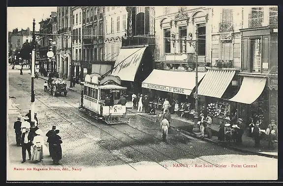 AK Nancy, Rue Saint-Dizier, Point Central, Strassenbahn
