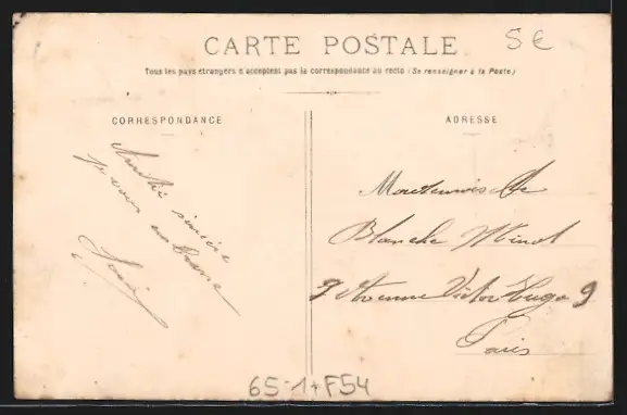 Personenbezogene Daten auf der Rückseite der Karte wurden durch blauen Textmarker unkenntlich gemacht. Die blauen Stellen sind auf die Vorderseite durchgeweicht und wirken sich negativ auf das Postkartenfoto aus