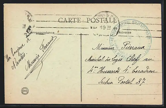 Personenbezogene Daten auf der Rückseite der Karte wurden durch blauen Textmarker unkenntlich gemacht. Die blauen Stellen sind auf die Vorderseite durchgeweicht und wirken sich negativ auf das Postkartenfoto aus