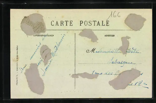 Personenbezogene Daten auf der Rückseite der Karte wurden durch blauen Textmarker unkenntlich gemacht. Die blauen Stellen sind auf die Vorderseite durchgeweicht und wirken sich negativ auf das Postkartenfoto aus