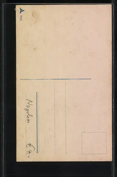Personenbezogene Daten auf der Rückseite der Karte wurden durch blauen Textmarker unkenntlich gemacht. Die blauen Stellen sind auf die Vorderseite durchgeweicht und wirken sich negativ auf das Postkartenfoto aus