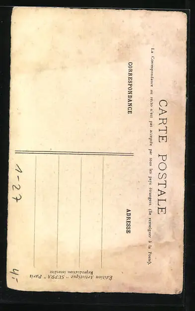 Personenbezogene Daten auf der Rückseite der Karte wurden durch blauen Textmarker unkenntlich gemacht. Die blauen Stellen sind auf die Vorderseite durchgeweicht und wirken sich negativ auf das Postkartenfoto aus
