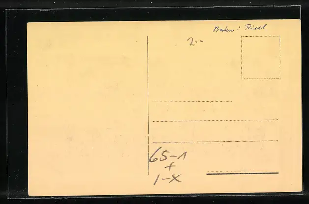 Personenbezogene Daten auf der Rückseite der Karte wurden durch blauen Textmarker unkenntlich gemacht. Die blauen Stellen sind auf die Vorderseite durchgeweicht und wirken sich negativ auf das Postkartenfoto aus