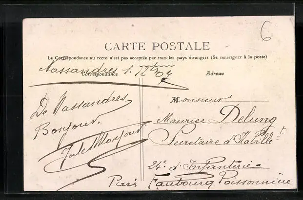 Personenbezogene Daten auf der Rückseite der Karte wurden durch blauen Textmarker unkenntlich gemacht. Die blauen Stellen sind auf die Vorderseite durchgeweicht und wirken sich negativ auf das Postkartenfoto aus