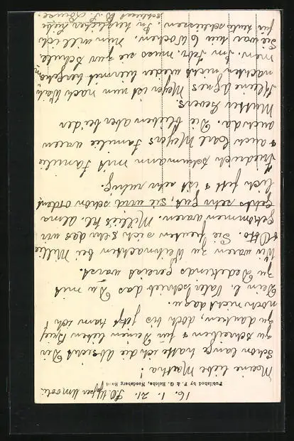 Personenbezogene Daten auf der Rückseite der Karte wurden durch blauen Textmarker unkenntlich gemacht. Die blauen Stellen sind auf die Vorderseite durchgeweicht und wirken sich negativ auf das Postkartenfoto aus