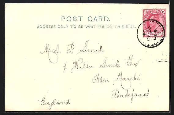 Personenbezogene Daten auf der Rückseite der Karte wurden durch blauen Textmarker unkenntlich gemacht. Die blauen Stellen sind auf die Vorderseite durchgeweicht und wirken sich negativ auf das Postkartenfoto aus