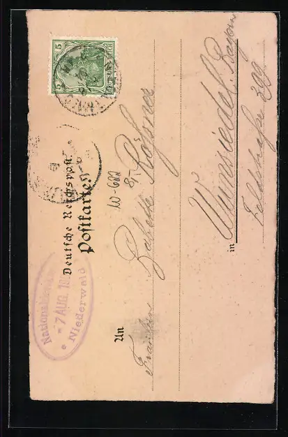 Personenbezogene Daten auf der Rückseite der Karte wurden durch blauen Textmarker unkenntlich gemacht. Die blauen Stellen sind auf die Vorderseite durchgeweicht und wirken sich negativ auf das Postkartenfoto aus