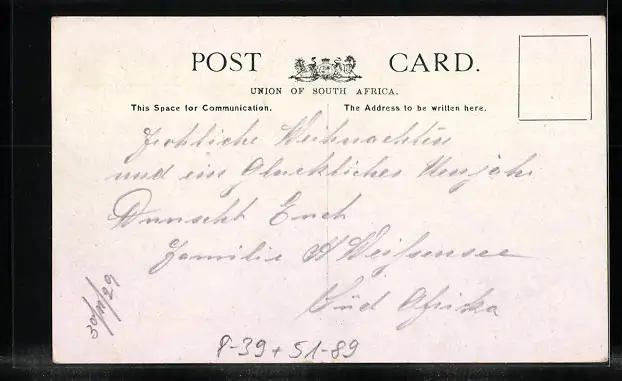 Personenbezogene Daten auf der Rückseite der Karte wurden durch blauen Textmarker unkenntlich gemacht. Die blauen Stellen sind auf die Vorderseite durchgeweicht und wirken sich negativ auf das Postkartenfoto aus