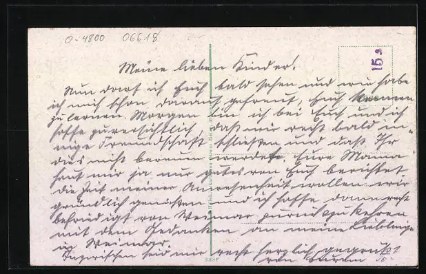 Personenbezogene Daten auf der Rückseite der Karte wurden durch blauen Textmarker unkenntlich gemacht. Die blauen Stellen sind auf die Vorderseite durchgeweicht und wirken sich negativ auf das Postkartenfoto aus