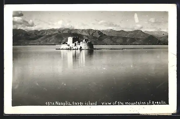 AK Nauplia, Burg island, View of the mountains of Argolis