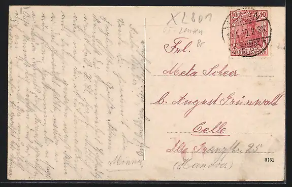 Personenbezogene Daten auf der Rückseite der Karte wurden durch blauen Textmarker unkenntlich gemacht. Die blauen Stellen sind auf die Vorderseite durchgeweicht und wirken sich negativ auf das Postkartenfoto aus