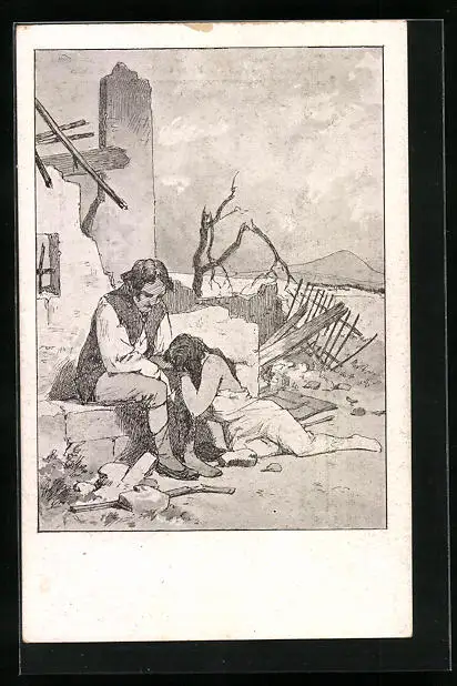 AK Návrat, Tschechische Frau weint inmitten Ruine