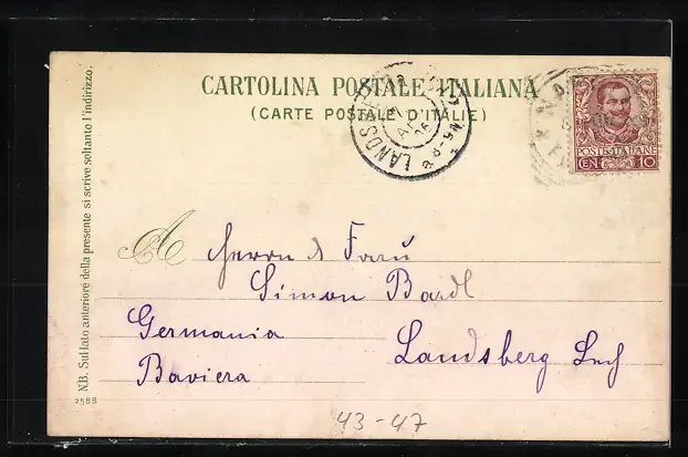 Personenbezogene Daten auf der Rückseite der Karte wurden durch blauen Textmarker unkenntlich gemacht. Die blauen Stellen sind auf die Vorderseite durchgeweicht und wirken sich negativ auf das Postkartenfoto aus